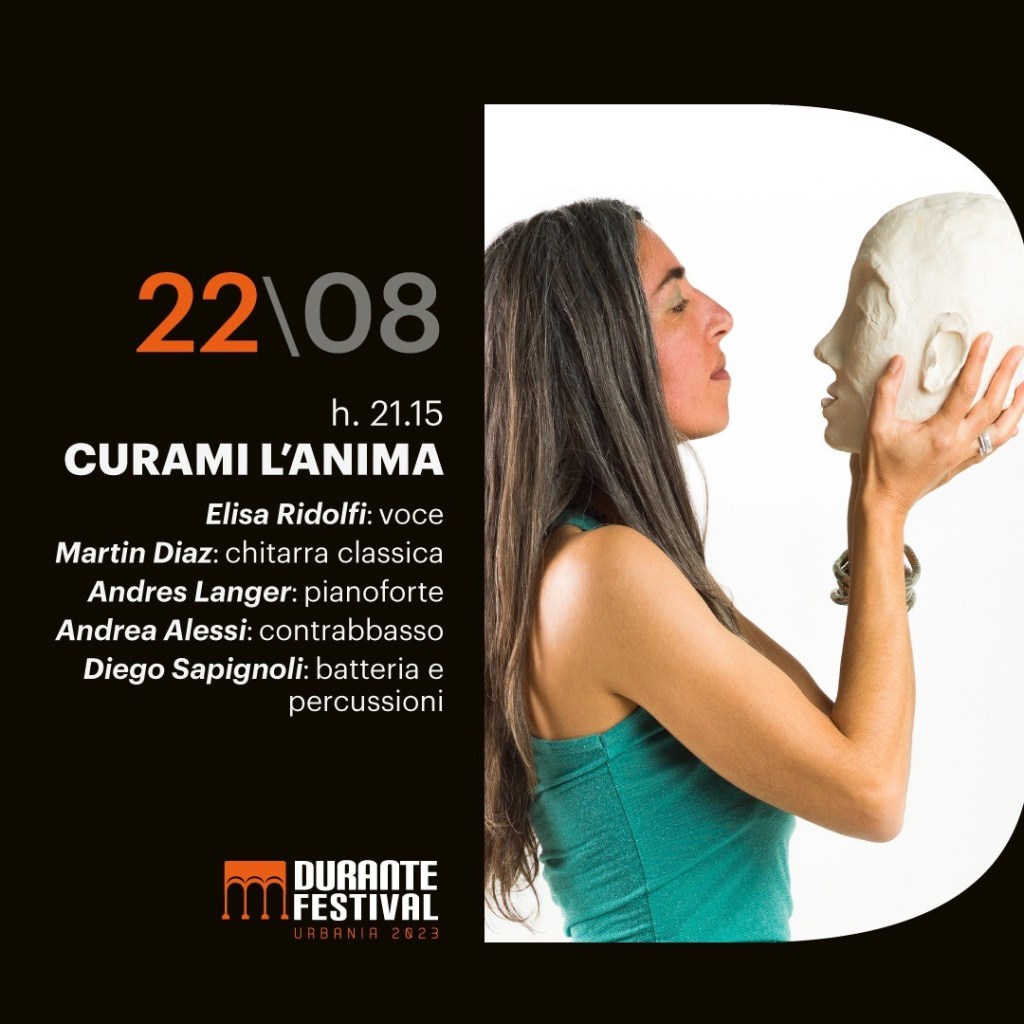 Martedì 22 agosto (ore 21.15) Durante Festival propone il live che prende vita dall’omonimo disco Curami l’Anima, pubblicato da Squilibri editore nel giugno 2023, della autrice, cantante, musicoterapeuta fanese Elisa Ridolfi. Sul palco del cortile del Palazzo Ducale di Urbania, la cantante sarà accompagnata da Martin Diaz alla chitarra classica, Andres Langer al pianoforte, Andrea Alessi al contrabbasso e Diego Sapignoli alla batteria e percussioni.