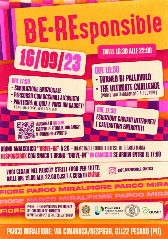 A tutti coloro che arriveranno entro le 17 al Miralfiore, Be-Responsible regalerà la “Responsibox” con snack e un buono per il drink analcolico Drive-In realizzato dalle studentesse e dagli studenti dell’istituto alberghiero Santa Marta di Pesaro nell’ambito del progetto. Numerose le attività pomeridiane in programma durante l’evento realizzato con il supporto di Auser Pesaro. In palio biglietti omaggio per un’escape room alle squadre vincitrici (e gadget per tutti i partecipanti) che si sfideranno nel torneo di pallavolo (squadre da 4 componenti ed eventuali 2 riserve) e in quello “The ultimate challenge”, la gara a squadre da 3 persone con 4 diverse prove per testare agilità, memoria, responsabilità e intesa del team. Iscrizioni al form: https://forms.gle/hueC9ypnVAfLaXJo9.