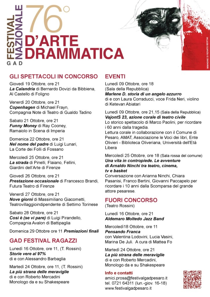 Si terrà a Pesaro dal 16 al 29 ottobre la 76a edizione del Festival Nazionale d’Arte Drammatica – GAD, che si attua con il sostegno di Comune di Pesaro, Ministero della Cultura, Regione Marche, Fondazione Cassa di Risparmio di Pesaro, Confesercenti Pesaro Urbino, Università dell’Età libera.