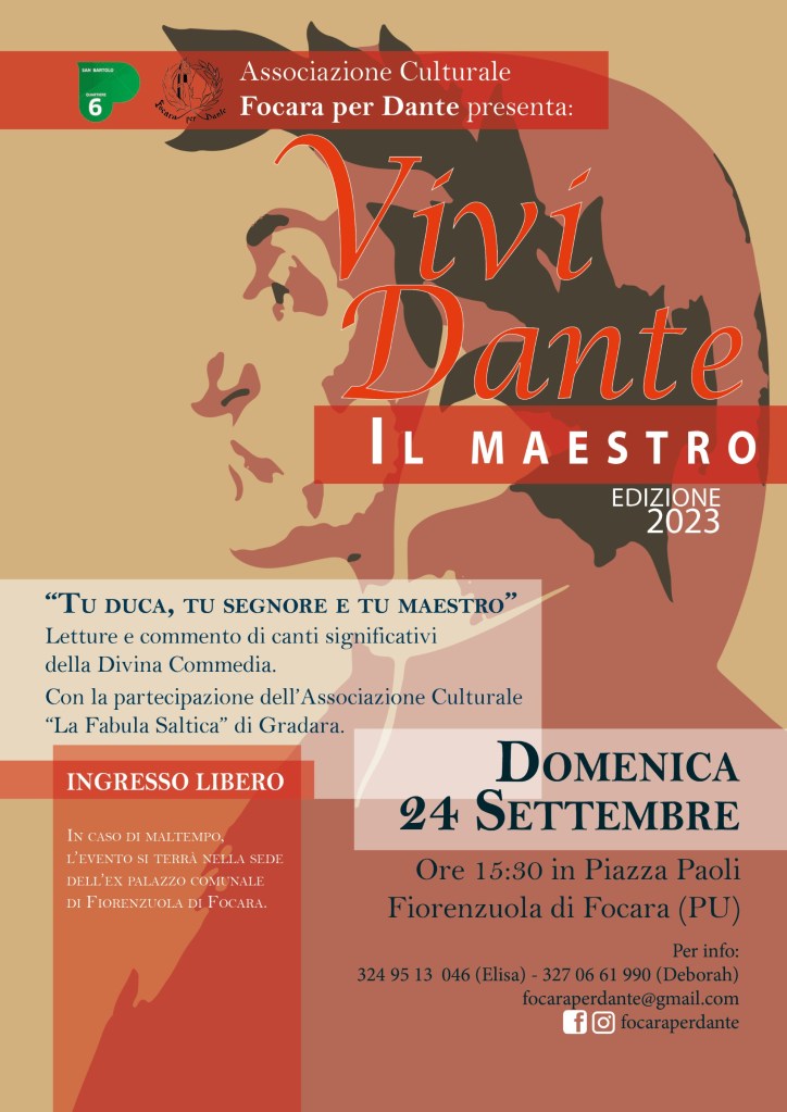 Pesaro, 22 settembre 2023 – Torna domenica 24 settembre l’appuntamento con i versi di Dante Alighieri. A Fiorenzuola di Focara, “Vivi Dante – il maestro” vedrà protagonisti numerosi lettori che daranno vita a una lunga maratona di lettura dei canti più suggestivi della Divina Commedia, a partire dalle 15.30. Ad accompagnarli ci saranno le melodie e i passi di danza dell’Associazione Culturale “La FabulaSaltica” di Gradara – Gruppo Danze Storiche. Se ci sarà bel tempo la manifestazione si svolgerà in Piazza Paoli. Se invece dovesse piovere, i lettori si trasferiranno nella sede dell’ex palazzo comunale, in via Dante 1, sempre a Fiorenzuola.