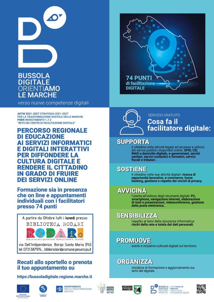 Il Comune di Pesaro ha aderito al progetto regionale ‘Bussola Digitale: OrientiAMO LE MARCHE verso nuove competenze digitali’, percorso triennale di educazione ai servizi informatici e digitali interattivi promosso dalla Regione Marche con l’obiettivo di accrescere le competenze e l’inclusione digitale di 60.000 marchigiani attraverso l’istituzione sul territorio di 74 punti di facilitazione. E uno di questi sarà la Biblioteca Rodari (via dell’Indipendenza), sede individuata dall’amministrazione in qualità di partner del progetto.