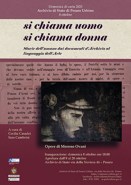 Questa è la riflessione da cui muove l’evento proposto dall’Archivio di Stato di Pesaro Urbino in occasione della Domenica di Carta 2023: ‘si chiama uomo si chiama donna’. Storie dell’umano dai documenti della Storia alle immagini dell’Arte, con opere di Moreno Ovani, a cura di Cecilia Casadei e Sara Cambrini; il titolo è tratto Da un verso di Mariangela Gualtieri.