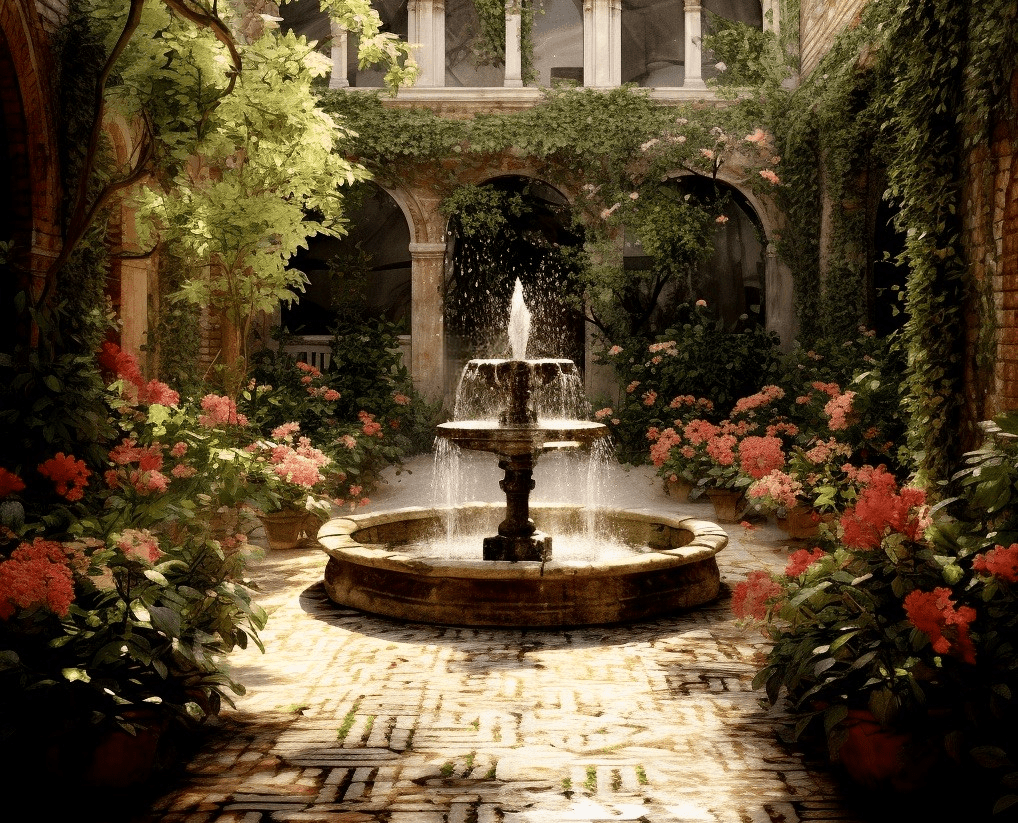 Nell’illustrazione digitale, un angolo di piccola corte antica sottoposta a restauro architettonico
