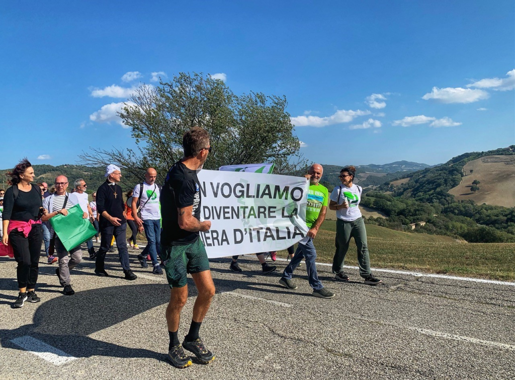 “La gente. È per questa gente che chiede decisioni giuste, che chiede rispetto e non ottiene risposte, è per questa gente che sono qui. Ma sono sorpreso da tutta l’attenzione che è su di me per le parole che dedico a Riceci. Dovrebbero essere altri, e non un Vescovo, a parlare, a sfilare con queste persone, a dire no alla discarica”. L’arcivescovo Sandro Salvucci esprime il suo pensiero, durante una sosta sulla strada bianca, uno dei simboli di Riceci, e la gente di Petriano, di Urbino, di Pesaro e di altre località si stringe intorno a lui, lo applaude a lungo, gli stringe la mano. Si è svolta oggi pomeriggio la “Camminata con il Vescovo”, da Montefabbri a Riceci, organizzata da DiversaMente. Centinaia di persone hanno aderito all’evento e hanno sfilato con bandiere, striscioni, cartelli. La strada sterrata ha imbiancato di polvere le loro scarpe; il sole quasi ancora estivo ha reso un po’ più ardui i tratti di salita, ma nessuno si è lamentato. Il corteo ha proceduto di buon passo e si sono notati tanti giovani, consapevoli dell’importanza dell’azione a difesa del bellissimo sito, di quanta bellezza, dignità e umanità toglierebbe ad esso una gigantesca discarica, una mostruosità invasiva e tossica, con la sua bruttura, il percolato avvelenato e le polveri sottili, il viavai di ruspe e camion. Andrea Torcoletti, Presidente di DiversaMente, avvalendosi di un megafono, ha illustrato con parole accessibili a tutti la qualità paesaggistiche, naturalistiche e i valori agrari dell’area su cui l’impresa ha messo gli occhi e affondato… le trivelle. Poi, le caratteristiche del progetto della maxi discarica. Giunti all’edicola della Madonna dei Sodi, prima della funzione religiosa celebrata da Monsignor Salvucci, l’Assessora alla sostenibilità e alla coesione del Comune di Pesaro Maria Rosa Conti e Roberto Malini hanno donato all’Arcivescovo il dipinto “La Madonna di Riceci”, pezzo unico di Malini (artista e attivista per l’ambiente) realizzato in una tecnica mista di intelligenza artificiale, pittura digitale e gouache. Monsignor Salvucci ha apprezzato il dono. “Mi piace molto. È un’opera moderna che riesce a emozionare come la pittura del XV secolo”. La funzione religiosa è stata seguita con devozione dalla gente, oggi confortata dalla missione pastorale dell’Arcivescovo, che difende l’ambiente sulle tracce di San Francesco e nello spirito dell’enciclica del Papa “Laudato si’”.