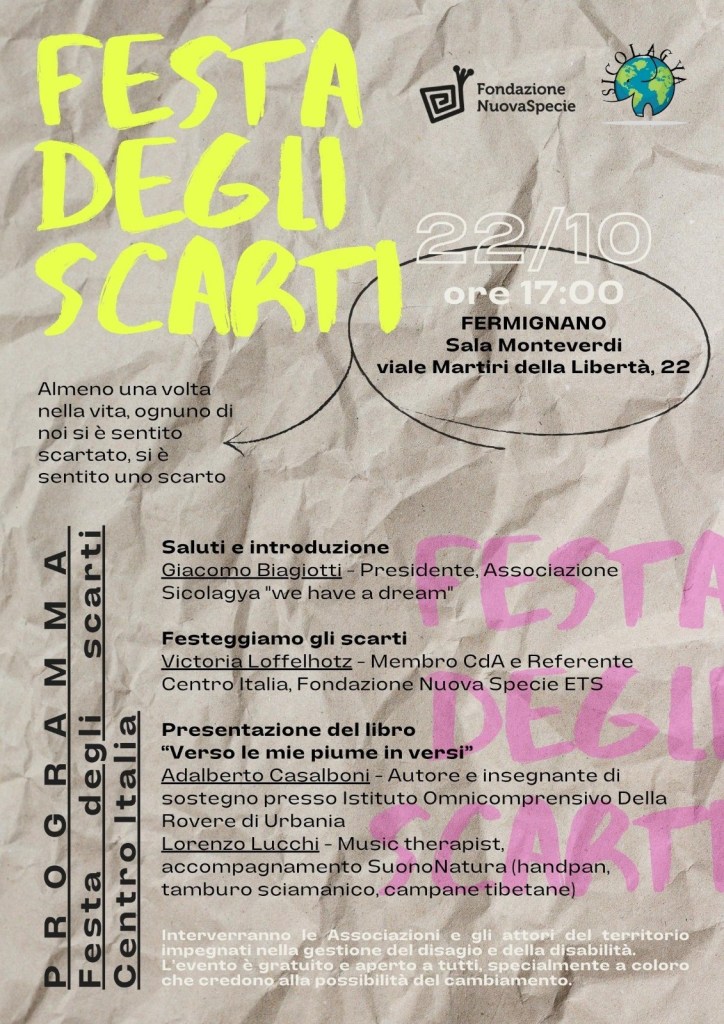 Il 22 ottobre c.m. alle ore 17.00 ci sarà un evento a Fermignano, presso la sala Monteverdi, organizzato dalla nostra Fondazione in collaborazione con l’Associazione “SICOLAGYA” e Giacomo Biagiotti.La Fondazione Nuova Specie ETS, operando a livello nazionale e proponendo un nuovo punto di vista sull’esistenza, ha istituito a cadenza annuale la Festa degli scarti, proprio per dare valore alle esperienze di attraversamento del disagio (da dis-adiacens: allontanarsi da se stessi) già avvenute oppure ancora da realizzare. Almeno una volta nella vita, ognuno di noi si è sentito scartato, si è sentito uno scarto. Tante persone si vivono questa sensazione molto, troppo spesso, ma con un adeguato accompagnamento ad esprimere la propria specificità, anche “la pietra che i costruttori hanno scartato è diventata testata d’angolo”.