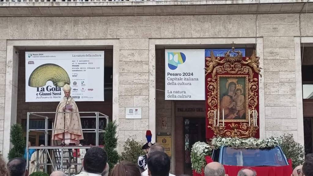 «La voce – spiega una corista e Presidente della commissione cultura Anna Maria Mattioli – è un grande dono che il Signore ci ha donato, a noi il compito di trasformarla in uno strumento di lode e gloria del suo nome per trasmettere l’amore e la buona Novella all’umanità intera. Se con il canto riusciamo a far spuntare un sorriso in un volto disperato, ad asciugare una lacrima dal volto di un fratello che piange, allora non abbiamo cantato inutilmente. Queste sono le parole che risuonano nei nostri cuori, questa è la voglia che ci unisce nel cantare la fonte della felicità. Siamo tornati a riaprire i nostri spartiti con le note per la Messa solenne, con la preziosa partecipazione di Donatella Bargnesi che ha intonato tutti i Salmi responsoriali e le Litanie dei Vespri, con grande capacità canora e coinvolgimento spirituale a supporto del fedeli e del coro accompagnato all’organo da Luca Grandicelli, al flauto da Mauro Puerini e al violino da Jenny Gaia Ficcadenti, con la direzione di padre Roseto Maria Saccà. Sotto il tempietto dedicato alla Madonna delle Grazie c’è stato gran fermento sin dal mattino, anche con la S.Messa delle 11.30 presieduta da P.Roseto M.Saccà e animata dal Coro “Resurrexit” diretto dal M°Roberto Renili e il Coro S.Maria delle Grazie non si è risparmiato sino all’ultima celebrazione delle ore 18.30 presieduta da Don Marco Di Giorgio, nuovo Vicario generale dell’Arcidiocesi di Pesaro, che ha ringraziato la corale per il bel servizio liturgico offerto. La Messa pontificale delle 17.30 è stata celebrata dal nostro Arcivescovo Sua Eccellenza Mons. Sandro Salvucci al rientro dalla processione e dal suo messaggio alla città e ci ha congedati con una profonda riflessione:- «… qual è il pericolo peggiore al quale dobbiamo porre attenzione? È “l’indifferenza” e il nostro non curarci più dell’altro, e vi invito a visitare la mostra in Piazza del Popolo dedicata a Don Gaudiano a trent’anni dalla sua scomparsa, “il prete degli ultimi” che non si è girato dall’altra parte di fronte ai fratelli sofferenti».