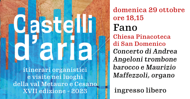 FANO – Domenica 29 ottobre, il sesto concerto della XVII° edizione di “Castelli d’Aria: in itinerari organistici nella val Metauro e Cesano”, si svolgerà a Fano, città capofila della Rassegna organizzata dal Laboratorio Armonico e la direzione artistica del M. Giovannimaria Perrucci. Lo spazio che ospiterà il concerto, programmato come di consueto alle ore 18.15, è la splendida ex-chiesa pinacoteca di San Domenico della Fondazione Cassa di Risparmio di Fano, partner dell’iniziativa. Documenti d’archivio attestano la presenza di importantissimi organi che si sono avvicendati nella chiesa, dotata originariamente di due cantorie contrapposte distrutte, assieme agli strumenti, a seguito degli ultimi eventi bellici. Recentemente la Fondazione ha operato per la ricollocazione di uno strumento nella chiesa, che attualmente prende posto nella cantoria ricostruita. Si tratta di uno strumento della fine del XVIII secolo, di scuola romana, restaurato dalla ditta Formentelli, che domenica ascolteremo in duo con un trombone barocco.