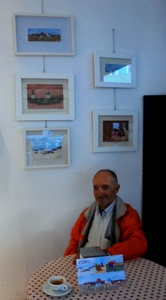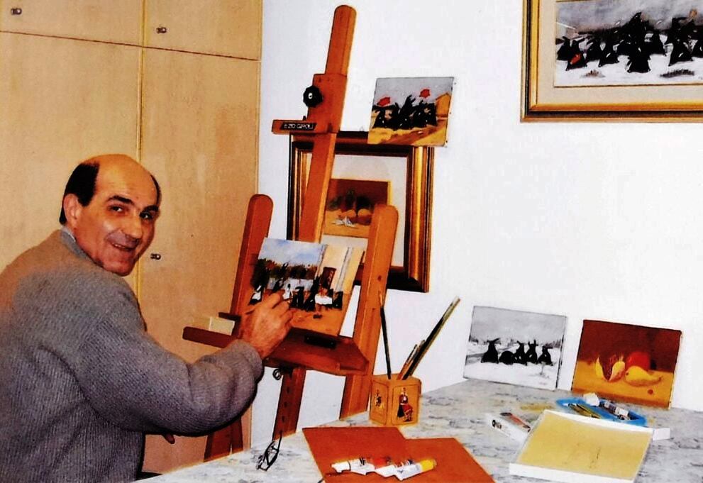 Arte a colazione a Pesaro in Via Mastrogiorgio presso il Bar Romeo. Tra cornetti, cappuccini e caffè si possono ammirare le opere di Ezio Giroli, fisioterapista della Victoria Libertas targata Scavolini (quella degli scudetti). Scatto di tigre, tocco morbido, sorriso rassicurante per capitan Magnifico e gli altri giocatori biancorossi: l’uomo dell’asciugamano asciutto, della bottiglia d’acqua fresca, dei cerotti e del liquido magico che fa risorgere dopo una caduta. Questo era Ezio sul parquet del Vecchio Hangar di Viale Marconi che, quando non massaggiava a scopo terapeutico i preziosi muscoli della palla al cesto, dipingeva nature morte, paesaggi ma soprattutto soggetti religiosi non in atteggiamento mistico, dei buffi pretini le cui sagome si profilano nette sullo sfondo di un paesaggio ventoso e di un cielo che sembra di piombo.
