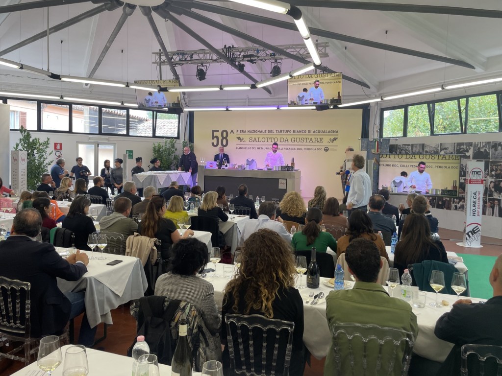 Come ogni anno il giorno di Ognissanti è una delle giornate più belle e partecipate della Fiera Nazionale del Tartufo Bianco di Acqualagna, che ha spalancato le porte a migliaia di turisti, con un record di affluenze nella sua quarta giornata e registrando un clamoroso sold-out dopo quello del weekend scorso. Ma si aspetta il maggior afflusso di visitatori nel weekend del 4 e 5 novembre con la prima sfida nazionale delle Città del Tartufo. Un evento senza precedenti, che riunirà alcune tra le principali città testimonial del tartufo in Italia e nel mondo per aggiudicarsi l’ambito premio ‘Tartufo Award’, in collaborazione con il top sponsor Luciana Mosconi. Ospite attesissimo nel weekend sarà Oscar Farinetti, che si unirà alla celebrazione di uno dei tesori gastronomici più prelibati d’Italia. Noto per aver creato un’esperienza gastronomica senza eguali con il concept Eataly, sarà il protagonista del talk show ispirato alla sua ultima fatica letteraria “10 mosse per affrontare il futuro dell’Italia: enogastronomia e turismo”, in programma domenica 5 novembre alle ore 11. Il riscontro delle giornate fa felicissimo il sindaco Luca Lisi: “Stiamo ricevendo tantissimi complimenti e attestati di stima per l’organizzazione della Fiera, che si presenta sempre più come un momento di eccellenza per Acqualagna e per l’intera regione Marche. Non solo come esaltazione della cucina al tartufo, ma sempre più come festival culturale del territorio e delle sue eccellenze. Da anni ci adoperiamo per il rilancio della figura di Enrico Mattei, nostro più illustre concittadino, che ha trovato un felice epilogo e un nuovo inizio con la sensibilità e il riconoscimento da parte della nostra Premier Giorgia Meloni”. Festeggiamenti in piazza Mattei per Cinzia Signoretti, originaria del posto, atleta della nazionale italiana, campionessa del mondo di bikejoring, nonché la corsa con il cane in bici nel bosco, dopo aver disputato la gara a Leipa in Germania, lo scorso weekend, dove hanno gareggiato circa mille atleti da tutto il mondo. “Il tartufo è un diamante in cucina, noi vogliamo valorizzarlo al meglio e poter offrire anche una connotazione nuova di carattere scientifico”. E’ quanto ha dichiarato Lidia Marchetti imprenditrice di T&C, azienda nata 33 anni fa ad Acqualagna, nel convegno sulla “Caratterizzazione mediante spettrometria di massa del Tartufo Bianco di Acqualagna (Tuber magnatum Pico) per la valorizzazione territoriale”. “Il tartufo bianco di Acqualagna ha delle caratteristiche uniche questo perché l’ambiente impatta fortemente sulla composizione di questo prodotto – ha spiegato il professore Gianni Sagratini, responsabile del Corso di Laurea in Scienze Gastronomiche, direttore della scuola di Scienza del Farmaco e prodotti della salute, Università di Camerino – al pubblico della Sala del Consiglio, Palazzo della Cultura, dimostrando l’importante contributo scientifico apportato dalla tesi di laurea del neo laureato Riccardo Marconi. La Fiera è proseguita con il cooking show di Daniele Patti, chef de Lo Scudiero ristorante di Pesaro, con una ricetta che è stata un trionfo di gusto: l’uovo d’oro al tartufo bianco di Acqualagna. Un grande spettacolo in cucina in cui lo chef ha sorpreso il pubblico con un abbinamento originale e gustosissimo. E poi assalto alla Scuola di Cucina da parte dei bambini nella lezione Mani in pasta, condotta dall’Associazione Professionale Cuochi Italiani, guidata da Antonio Bedini.