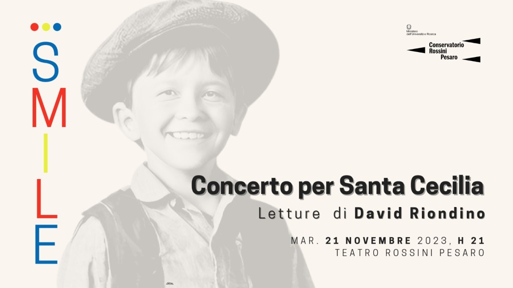Il concerto, inserito all’interno del progetto “Pesaro per Santa Cecilia” e realizzato in collaborazione con il Comune di Pesaro, la Provincia di Pesaro-Urbino, Pesaro 2024, AMAT e il Circolo Amici della Lirica “G. Rossini”, avrà una forma particolare rispetto al passato sia per la scelta dei gruppi strumentali sia per i generi proposti. Sul palco si alterneranno ensemble di flauti, di clarinetti, di violoncelli (Rossini Cellos Orchestra), di sassofoni e complessi jazzistici (Jazz Ensemble), con una eclettica commistione di stili musicali, dalla rivisitazione di classici alla musica da film di Riz Ortolani, alla tradizione argentina del tango con Astor Piazzolla, e poi ancora George Gershwin e standard del repertorio jazz. Trait d’union della serata ed ospite d’eccezione sarà David Riondino, artista poliedrico (cantautore, attore, regista, scrittore), che, con il suo spirito sagace e la lettura di poesie di Ernesto Ragazzoni, guiderà il pubblico in mondi altri, visionari. La composita articolazione del repertorio e la presenza di David Riondino hanno suggerito la scelta del titolo del concerto: Smile.