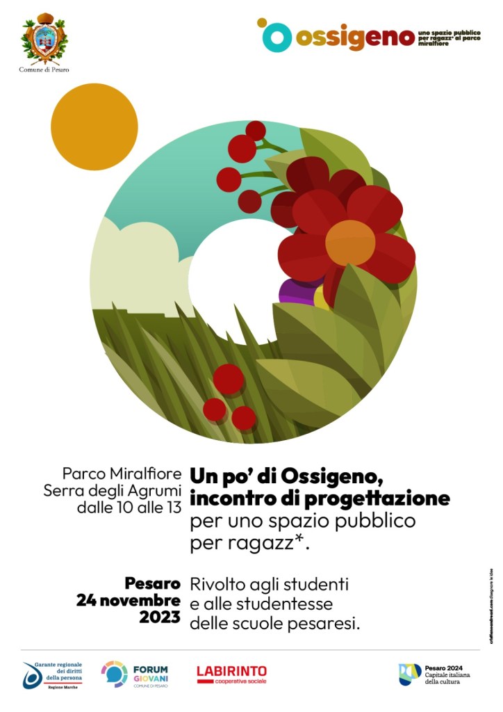 (Pesaro) – Esprimere proposte, idee, desideri per progettare insieme a studentesse e studenti delle scuole secondarie del territorio uno spazio pubblico nella città di Pesaro dedicato, curato e gestito dai giovani. È lo scopo di Ossigeno, progetto che valorizza il protagonismo di ragazze e ragazzi pesaresi e che dà appuntamento ai suoi protagonisti venerdì 24 novembre, dalle 9.00 alle 13.00, alla Serra degli agrumi del Parco Miralfiore per una mattinata di lavori e scambi promossa dal Comune di Pesaro, che parteciperà insieme agli altri partner del progetto – Forum Giovani e Consulta provinciale degli studenti e Labirinto cooperativa sociale – e al Garante regionale per i diritti alla persona Giancarlo Giulianelli.