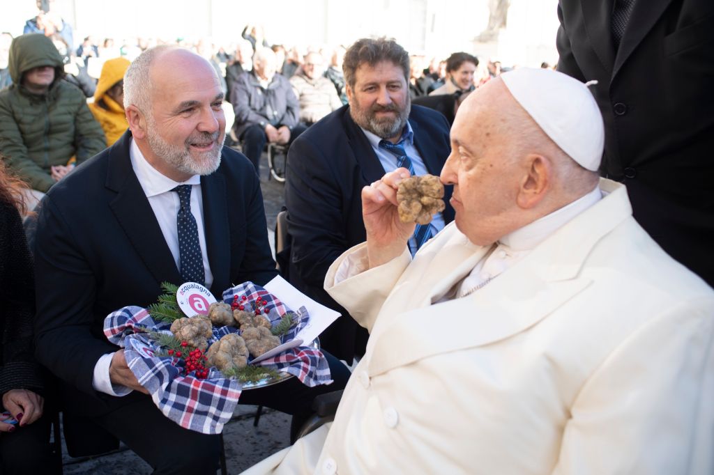 Il sindaco Luca Lisi ieri all’Udienza Generale del mercoledì del Santo Padre. “Una giornata memorabile” iniziata con le parole profonde e toccanti di Papa Francesco da piazza San Pietro, gremita di fedeli provenienti da tutti i continenti. Al termine dell’udienza, il sindaco ha consegnato a Papa Francesco degli splendidi e profumatissimi tartufi bianchi di Acqualagna.