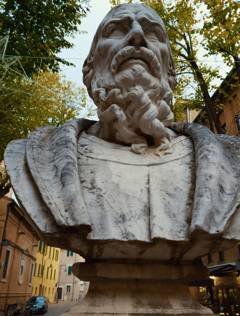 Quante volte abbiamo posato gli occhi sul busto di Pandolfo Collenuccio, nel piazzale a lui dedicato lungo via Rossini? È una scultura di Leandro Ricci, scultore del primo Novecento cui dobbiamo anche le panchine con i leoni alati in piazza della Libertà e le sfingi del Polo (spesso, purtroppo, riverniciate alla bell’e meglio). Da un po’ di tempo, purtroppo, la scultura è sporca, annerita, colpita da muffe e trascurata.