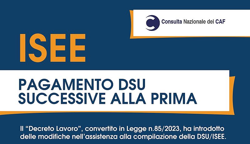 Come stabilito dal Governo con il Decreto Lavoro n. 48/2023, convertito in Legge n. 85/2023, a partire dal 1° ottobre 2023, rimane gratuito esclusivamente il servizio di assistenza alle famiglie per la compilazione della prima DSU/ISEE e per quelle successive in presenza di variazione dei componenti il nucleo familiare.