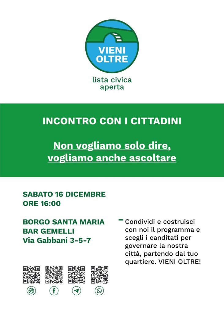 Continua la campagna di “ascolto dei cittadini” che sta portando la lista civica aperta VIENI OLTRE nei quartieri della città.