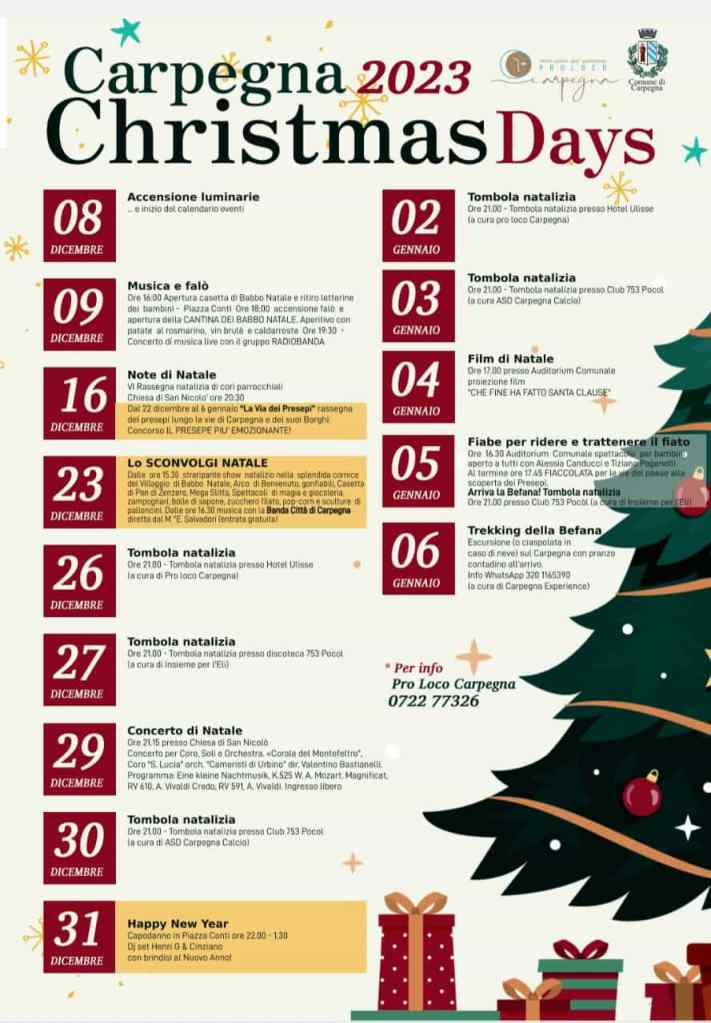“E’ un programma di Natale molto ricco e di qualità pensato per i nostri concittadini e quelli del Montefeltro, ma anche per i tanti turisti che di solito vengono a trovarci nel periodo natalizio ed in particolare per la festa in piazza dei Conti dell’ultimo dell’anno . Particolare attenzione abbiamo rivolto alle iniziative pensate per i bambini e ragazzi – evidenzia l’assessore alla Cultura di Carpegna, Luca Pasquini – . Un grazie particolare va alla Pro Loco di Carpegna che è co-organizzatrice di tutto il calendario degli eventi natalizi e alle altre associazioni che vi hanno collaborato: Insieme per l’Eli, Carpegna Calcio, Carpegna Experience e il coro della Parrocchia di San Nicolò”. Pasquini fa quindi notare che “questo è un brutto momento per tutti, a causa di due guerre terribili vicine a noi, perciò proviamo, con queste iniziative, a portare un po’ di serenità e divertimento qui a Carpegna, in attesa dei tantissimi eventi che si svolgeranno in tutto il territorio provinciale per Pesaro Capitale Italiana della Cultura 2024”.