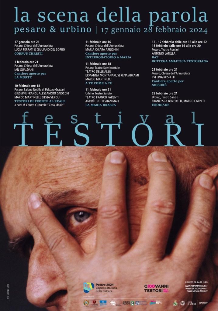Le parole di Testori dedicate alla crocifissione, lette da Lucia Ferrati, dialogano il 17 gennaio alla Chiesa dell’Annunziata di Pesaro in Corpus Christi con la performance pittorica dell’artista Giuliano Del Sorbo in un appuntamento di grande impatto. Ancora la Chiesa dell’Annunziata accoglie il progetto di residenza per La morte, di e con Ian Gualbani dal testo di Testori. Nella ormai abituale forma di “Cantiere aperto”, il pubblico potrà assistere il 1 febbraio all’affascinante genesi del lavoro che affronta “il cuore sanguinante dell’inquietudine umana”. Il 10 febbraio, a cura del Centro Culturale Città Ideale, alla Sala della Repubblica del Teatro Rossini è la volta di Testori di fronte al reale, dialogo su Testori “giornalista” con Silvia Veroli, giornalista del quotidiano “Il manifesto”, Alessandro Gnocchi, scrittore e autore di Testori Corsaro (Mani di Teseo), Marco Martinelli, drammaturgo e regista teatrale, moderato da Giuseppe Frangi, giornalista e presidente dell’Associazione culturale Casa Testori, nonché nipote di Giovanni Testori. Un trittico di proposte per l’11 febbraio. A Pesaro alle ore 16 alla Chiesa dell’Annunziata si entra ancora nella genesi del lavoro di creazione di Maria Chiara Arrighini con Cantiere aperto per “Interrogatorio a Maria”, “una possibilità estremamente stimolante – afferma l’artista – per interrogarmi su quello che è stato il mio rapporto con “l’irraggiungibilità” di questa figura femminile”. Alle ore 18 al Teatro Sperimentale la voce di Ermanna Montanari e il canto di Serena Abrami offrono A te come a te, spettacolo nato dalla suggestione di portare in scena la scrittura giornalistica di Testori con un focus su tre articoli legati da un filo preciso, la violenza sulle donne. La giornata si conclude al Teatro Sanzio di Urbino alle ore 21 con La Maria Brasca, testo di Testori vivo e moderno nella lettura di Andrée Ruth Shammah, con l’interpretazione di Marina Rocco, Mariella Valentini, Luca Sandri, Filippo Lai. Lo spettacolo offre una storia al femminile disegnata negli anni Sessanta con efficace realismo sociale dal grande drammaturgo milanese. BAT_Bottega Amletica Testoriana in scena al Teatro Rossini di Pesaro dal 13 al 17 febbraio (dalle ore 18 alle ore 22) e il 18 febbraio (dalle ore 16 alle 20) è un progetto curato da Antonio Latella con l’obiettivo di mettere in relazione attrici e attori con la poetica di Giovanni Testori. Il progetto è promosso da AMAT per Pesaro 2024 Capitale Italiana della Cultura (progetto di Comune di Pesaro, MiC e Regione Marche con Fondazione Pescheria), Piccolo Teatro di Milano – Teatro d’Europa e stabilemobile, in collaborazione con Associazione Giovanni Testori. Il percorso di formazione vede coinvolti otto giovani donne e uomini del teatro italiano – Noemi Apuzzo, Alessandro Bandini, Andrea Dante Benazzo, Matilde Bernardi, Flavio Capuzzo Dolcetta, Chiara Ferrara, Sebastian Luque Herrera, Beatrice Verzotti – affiancati da otto spettatrici / spettatori “in avamposto”, divenuti complici della ricerca degli attori in una sorta di inedita “complicità”. Il lavoro della Bottega è incentrato su Amleto. Una storia per il cinema, L’Ambleto e Post-Hamlet di Giovanni Tesori, testi che si fanno testamento di una vita e di un’infaticabile attività artistica. Il 23 febbraio si torna alla Chiesa dell’Annunziata con un altro progetto di residenza che si mostra al pubblico in forma di Cantiere aperto e vede coinvolta Evelina Rosselli in un confronto con le parole della tragedia Sdisorè, riscrittura testoriana de l’Orestea di Eschilo. Il 28 febbraio per la conclusione di Festival Testori al Teatro Sanzio di Urbino Erodiade nell’interpretazione di Francesca Benedetti, musa dell’autore milanese, che affronta la scrittura testoriana facendosi carne e sangue e immergendosi in un flusso verbale senza precedenti per restituire al pubblico, nello spettacolo a cura di Marco Carniti, il mito ribaltato di un personaggio controverso e trasgressivo, che oggi si fa vittima più che carnefice.