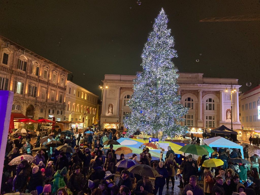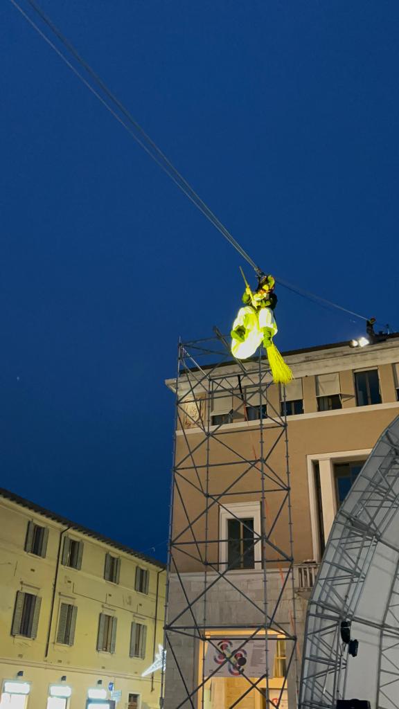 Le Befana ha sfidato il maltempo volando, a bordo della sua scopa magica, su piazza del Popolo per stupire ed emozionare le famiglie presenti al pomeriggio del Natale da Capitale. In centinaia questo pomeriggio, nonostante il tempo incerto, per l’appuntamento “È arrivata la Befana” promosso dal Comune di Pesaro nell’ambito delle iniziative di “Pesaro nel Cuore” che ha tenuto tutti col naso all’insù per la spettacolare discesa di 22 metri compiuta dalla vecchina più amata d’Italia – guidata dai pompieri del nucleo specialistico del comando provinciale Vigili del fuoco – dal tetto del Municipio.