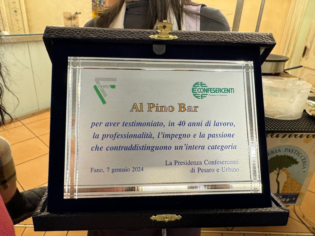 Nella motivazione della targa, che è stata consegnata per mano del direttore provinciale Confesercenti Alessandro Ligurgo e del responsabile sindacale Confesercenti di Fano Stefano Mirisola, si ricorda come il Pino Bar abbia testimoniato in 40 anni di lavoro, “la professionalità, l’impegno e la passione che contraddistinguono un’intera categoria”.