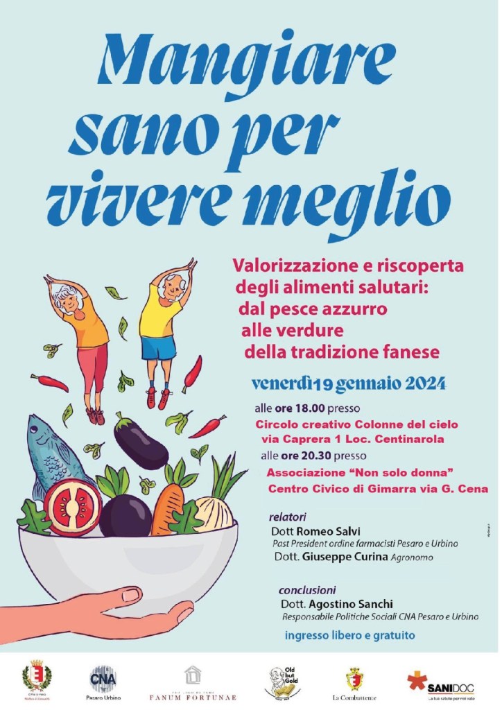 Su questo tema CNA Pensionati di Pesaro e Urbino ha organizzato un nuovo doppio incontro pubblico dal titolo “Mangiare sano per vivere meglio”, valorizzazione e riscoperta degli alimenti salutari: dal pesce azzurro, prodotto del pescato della marineria fanese (sardine, aringhe, alici, sgombri, cefali, suri, alacce, etc.) alle verdure della tradizione del territorio (broccoli, cavolfiore tardivo, gobbi, verze, carciofi, etc.).
