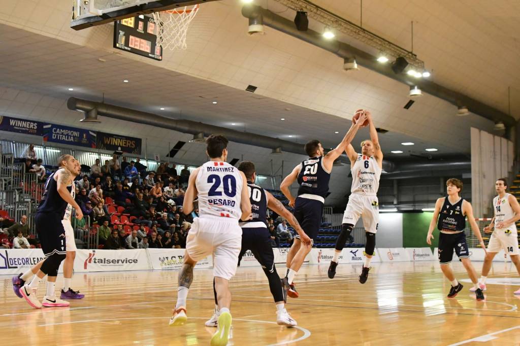 Grande prestazione, grande vittoria e aggancio al primo posto. Turno infrasettimanale praticamente perfetto per l’Italservice Loreto Pesaro che conquista il derby battendo il Bramante 76 a 56 e lo raggiunge in vetta, dove il traffico ora è “intasato”: complice la sconfitta del Matelica e il contemporaneo successo della Goldengas Senigallia infatti, in testa alla classifica del girone E di Serie B Interregionale ci sono ben quattro squadre. Tutto ciò quando mancano solo 5 giornate al termine della prima fase. Peraltro domenica a Senigallia si affronteranno due delle leader, ovvero Goldengas e Italservice, in una sfida speciale in particolare per due grandi ex, oggi gialloblu, come coach Stefan Foglietti e il General Manager Federico Ligi. Sarà un’altra tappa cruciale, perché le prime quattro classificate della prima fase, in quella successiva – la fase Gold – potranno contare sui punti ottenuti sin qui negli scontri diretti. Tempo al tempo, ora godiamoci i due punti ottenuti nella stracittadina, poi da domani si penserà alla prossima battaglia.