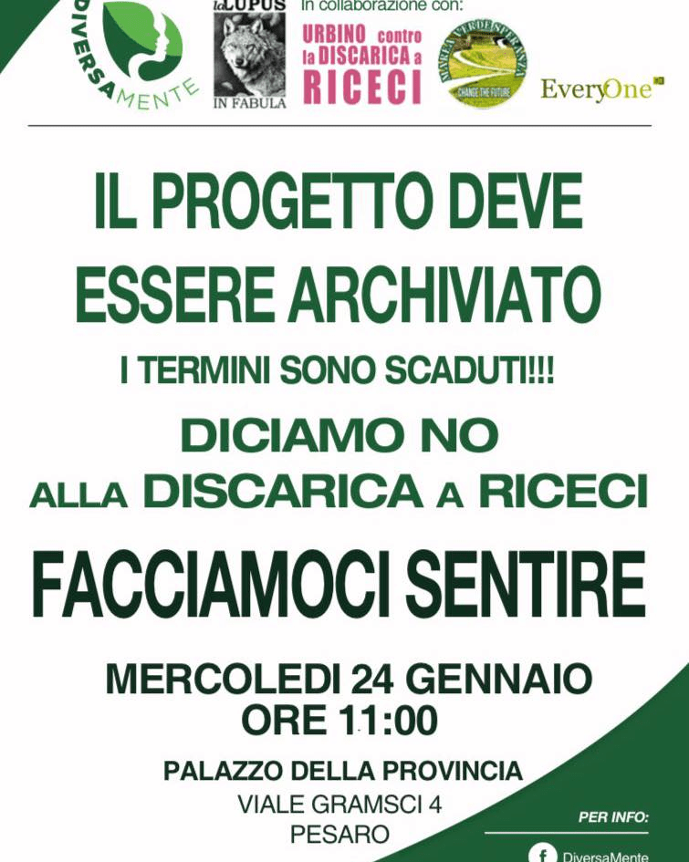 Domani, mercoledì 24 gennaio dalle ore 11.00 in viale Gramsci, davanti alla Provincia, manifestazione per chiedere alle nostre istituzioni di mantenere gli impegni (più volte assunti e pubblicati sulla stampa locale) e chiudere il progetto di una gigantesca discarica a Riceci, paesaggio naturale incontaminato e sito storico legato a Raffaello e al Rinascimento urbinate