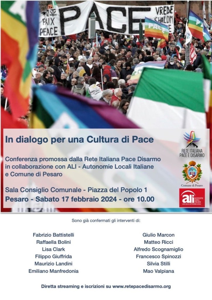 Sabato 17 febbraio, alle 10 nella Sala del Consiglio, il Comune di Pesaro e Ali – Autonomie Locali Italiane sostengono l’iniziativa “In dialogo per una Cultura di Pace” promossa dalla Rete Italiana Pace e Disarmo. Un incontro di lancio per la giornata di mobilitazione nazionale che si terrà il 24 febbraio in tutte le città italiane, per “chiedere il cessate il fuoco in Palestina ed in Ucraina e per dire NO a tutte le guerre e NO al riarmo”.