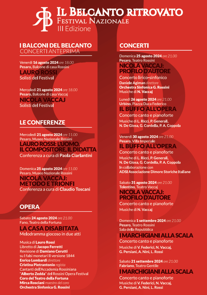 La mattina successiva, domenica 25 agosto 2024 ore 11.00, al Museo Rossini il Prof. Claudio Toscani, tra i musicologi più insigni del nostro Paese, approfondirà la figura di Nicola Vaccaj, autore del famoso Metodo per cantanti, adottato ancora oggi nei Conservatori di Musica italiani e non solo, e firma di opere liriche di grandissimo