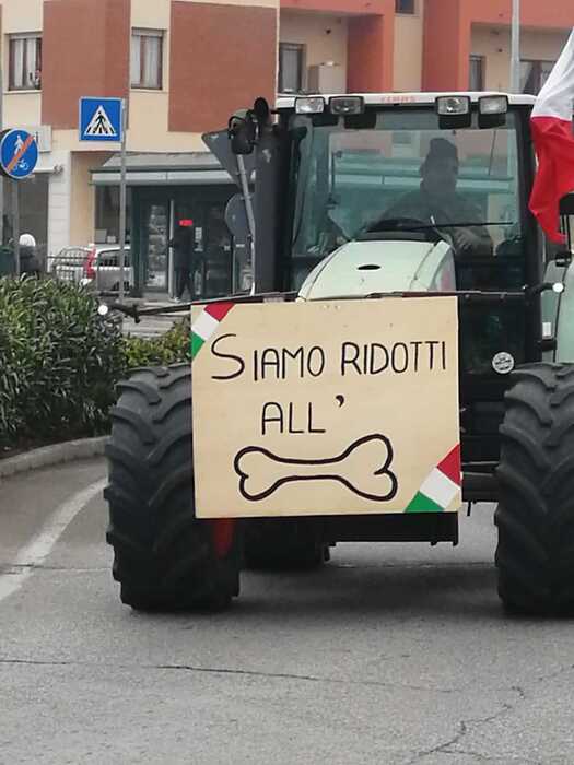 I mezzi agricoli sono scortati dalla polizia e espongono bandiere tricolori e cartelli, con le scritte “Rip agricoltura italiana” e “Siamo ridotti all’osso”.