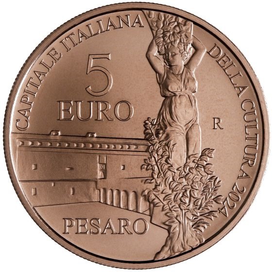 È stata emessa oggi, martedì 20 febbraio, dal Ministero dell’Economia e delle Finanze e realizzata dall’Istituto Poligrafico e Zecca dello Stato, la prima moneta della Collezione Numismatica della Repubblica italiana 2024 dedicata a Pesaro Capitale italiana della Cultura 2024. La moneta in rame, dal valore nominale di 5 euro, ha una tiratura di 4.500 pezzi e si presenta in versione Fior di Conio. Realizzata dall’artista incisore Uliana Pernazza e prodotta presso le Officine della Zecca dello Stato, riproduce nel “dritto” Rocca Costanza, mentre nel “rovescio” Palazzo Ducale e la fontana di Piazza del Popolo. Nel giro, la scritta “Capitale italiana della cultura 2024”; in basso “Pesaro”; a sinistra, il valore “5 Euro”; a destra, “R”, identificativo della Zecca di Roma.