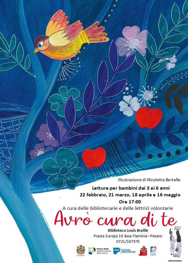 Parte giovedì 22 febbraio alle 17, alla Biblioteca Louis Braille ‘Avrò cura di te’, ciclo di 4 appuntamenti – ogni terzo giovedì del mese – rivolti ai più piccoli e ai loro genitori, promosso da Pesaro Biblioteche. L’iniziativa nasce dall’idea di interpretare – pensando al pubblico dei piccini – ‘La natura della cultura’ principio che guida l’intero percorso di Pesaro 2024 – Capitale italiana della cultura 2024. La Biblioteca Braille, che aderisce al progetto nazionale Nati per leggere, ha pensato di dare un tema alle storie adatte alla loro età. Ogni appuntamento accompagnerà bambini e genitori alla scoperta di storie che avranno come protagonisti le stelle e la luna, le onde del mare, gli animali del bosco o il bruco del proprio giardino: insomma la natura che fin da piccoli li circonda. Parte delle attività di Pesaro Città che legge, la proposta si rivolge ai bambini dai 3 ai 6 anni. Le letture sono a cura delle bibliotecarie con la partecipazione delle Lettrici Volontarie Nati per Leggere.