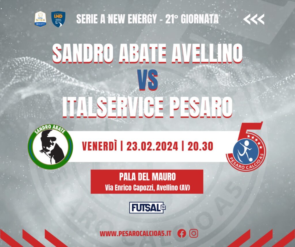 Sandro Abate-Italservice Pesaro è in programma domani sera, alle ore 20.30, al Pala Del Mauro di Avellino (consueta diretta streaming su Futsaltv.it). E’ la sesta giornata del girone di ritorno di Serie A e Pesaro ci arriva come noto dopo una settimana molto intensa. Prima il pari casalingo con la Meta Catania, 5 a 5 frutto di una rimonta pesarese straordinaria (da 1-4 a 5-4) e del pareggio finale dei siciliani molto contestato dai rossiniani, così come tutta la direzione di gara. Poi la sconfitta ai supplementari nei quarti di Coppa Italia, martedì, a Roma, sul campo dell’Olimpus Roma al termine di una grande prestazione dei ragazzi di mister Scarpitti e una eliminazione simile al pareggio col Catania: Pesaro avanti 2 a 0 nel primo tempo e rimonta dei romani condizionata da alcune decisioni arbitrali altrettanto contestate.