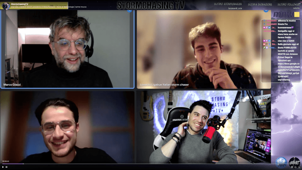 Primo anno di vita della Stormchasing TV, ideata dal Cacciatore di Temporali gradarese Francesco Gennari. Tanti gli ospiti che anno animato le dirette nel corso di questi dodici mesi. Il format del canale streaming sulla piattaforma Twitch, insieme a Emilia Romagna Meteo, ha anche seguito in diretta i drammatici giorni dell’alluvione in Emilia Romagna dello scorso maggio. In allegato alcuni scatti delle dirette.