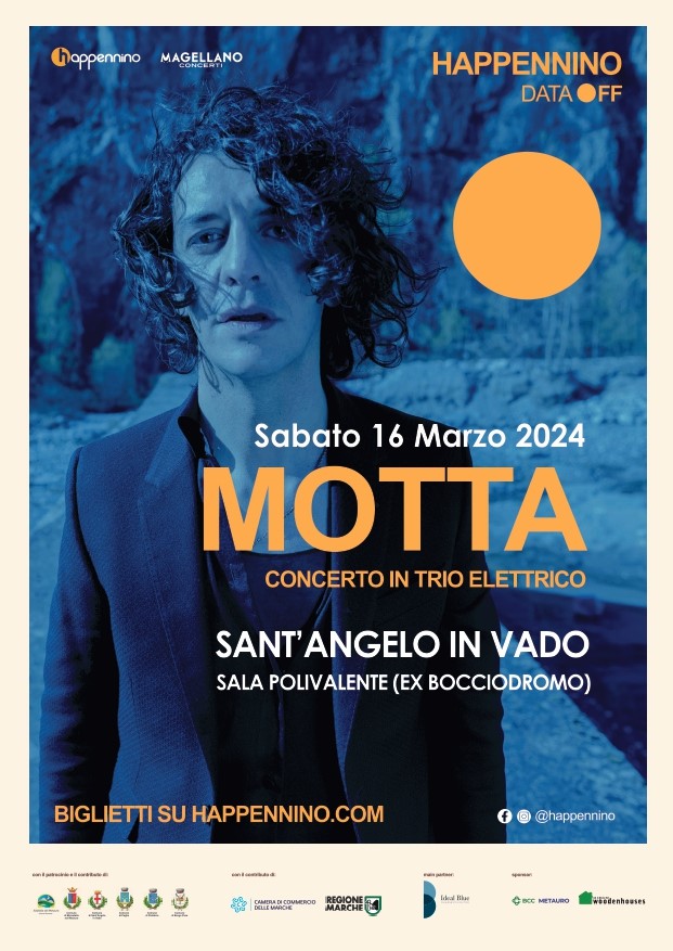 SANT’ANGELO IN VADO (Pesaro e Urbino)- Sarà un “Happennino data OFF”, un evento fuori stagione ma di grande spessore quello che porterà il cantautore toscano Francesco Motta sul palco della Sala Polivalente (ex Bocciodromo) di Sant’Angelo in Vado.