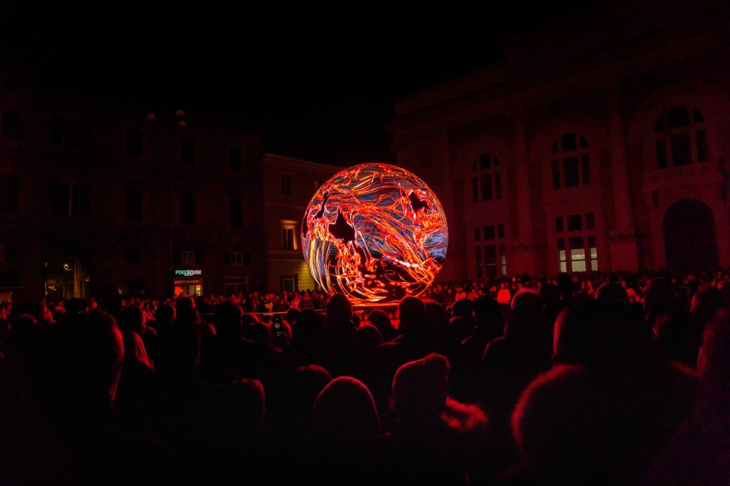 La prima opera è Pesaro 2024, che punta alla valorizzazione del territorio e della cultura della città. Sulla superficie sferica vengono visualizzati video a 360 gradi del patrimonio paesaggistico, storico, artistico-culturale del territorio. Una reale immersione che permette di ripercorrere i luoghi della Capitale con una modalità inedita. Stravolgendo la percezione canonica, la visione sferica, apre a una dimensione tridimensionale e fa immergere il pubblico in una esperienza dello spazio a metà tra mondo reale e digitale.