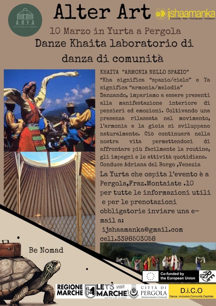 All’interno della Yurta situata a Montaiate di Pergola, nel verde di un bosco in collina, prosegue il programma sabato 10 marzo (ore 11-13 e 15-18) con un workshop aperto a tutte le età, abilità e professionalità di danza comunitaria Khaita. Guiderà l’incontro Adriana Del Borgo, docente di Venezia che da oltre 20 anni pratica questa disciplina in cui la cura dello spazio interiore e dello spazio esterno sono i temi della pratica danzata. Nasce dalla cultura indigena tibetana in cui il principio di non violenza ed armonia con gli elementi naturali sono caratterizzanti dell’identità culturale del popolo tibetano. Tra le due sessioni pranzo condiviso secondo la tradizione marchigiana de la “gluppa”.