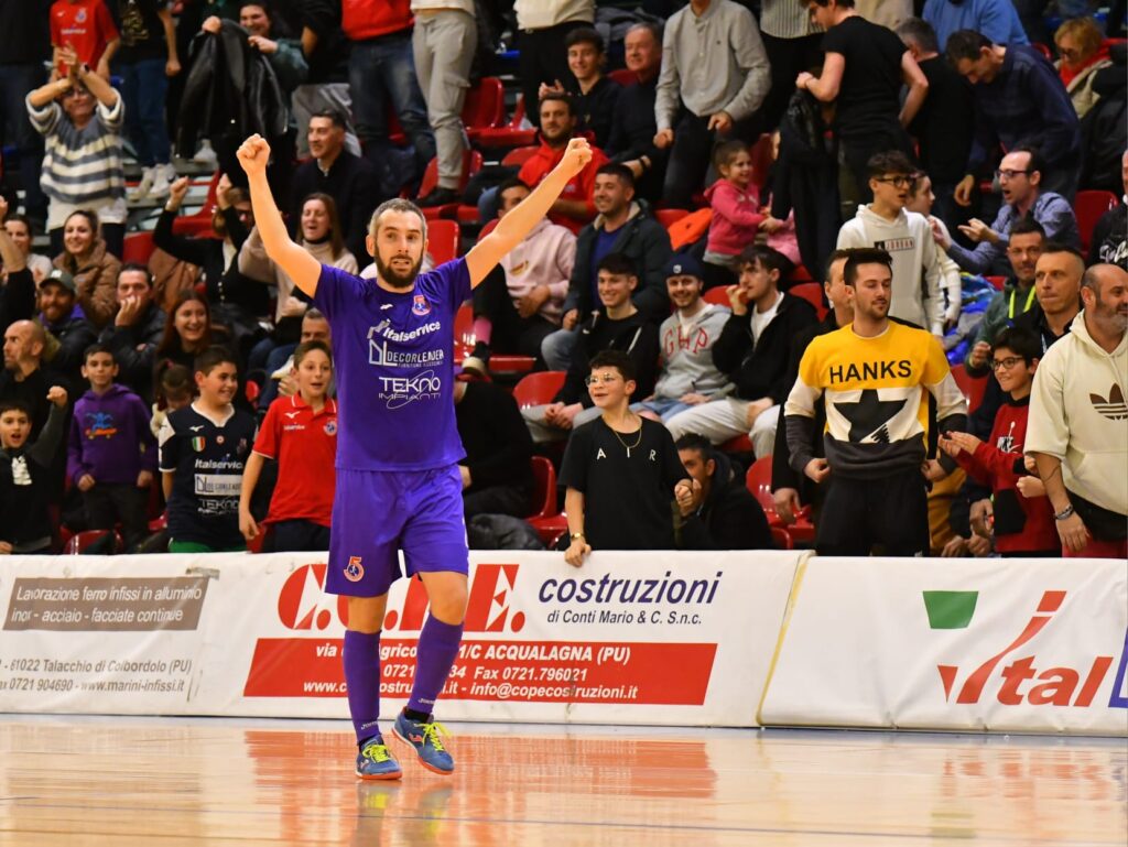 Secondo tempo? Come il primo. Pesaro spinge, spinge, spinge. E Mammarella para tutto, oppure qualche ottima chance termina fuori di poco. Daje e ridaje però, al 12′, ecco finalmente il gol del 2 a 1: lo realizza – anche lui da ex – Umberto Caruso, che di tigna da terra col sinistro infila all’angolino. Esplode il PalaMegabox. E’ 2 a 1 a 8 minuti dal termine. Due minuti dopo su una ripartenza dell’Ecocity, tocca a Putano cancellare un gol quasi fatto di De Oliveira. Paratissima. Quindi portiere di movimento inserito da mister Angelini. Il quintetto biancorosso lotta, difende, soffre. E a 65 secondi in contropiede Murilo Schiochet infila la palla del 3 a 1 su assist immancabile di Barichello. Che poco dopo intercetta palla e dalla sua metà disegna un altro gol dell’ex, il 4 a 1 definitivo.