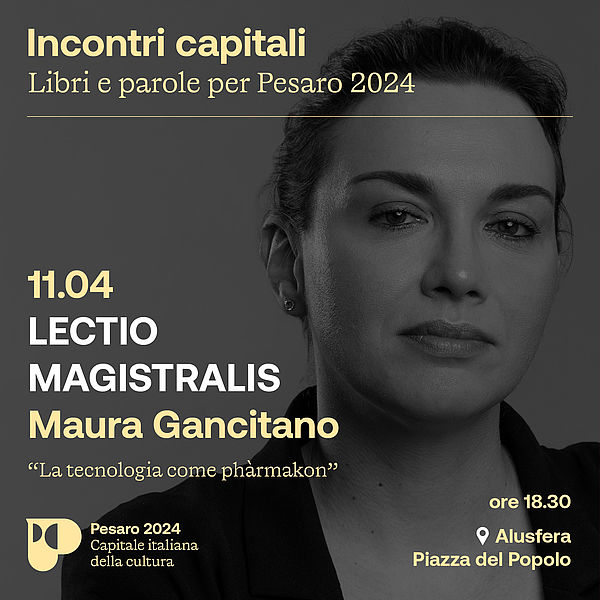 All’interno di ‘Incontri capitali’ prosegue il ciclo delle lectio magistralis: giovedì 11 aprile ospite a Pesaro sarà Maura Gancitano che interverrà sul tema ‘La tecnologia come phàrmakon’ (Alusfera di piazza del Popolo, ore 18.30).