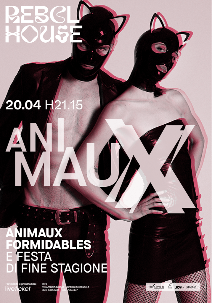 Ultimo appuntamento della stagione sabato 20 aprile a Rebel House. Nel magico salotto affrescato di Palazzo Mattei Baldini a Pergola, alle 21.15 è in programma il concerto degli Animaux Formidables, il duo garage-fuzz-noise, con percussioni e chitarra-voce, che ha riscosso grande successo a X Factor 2023.
