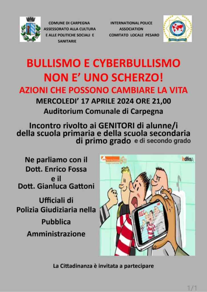 “Bullismo e Cyberbullismo” sono stati i temi al centro dell’incontro pubblico organizzato ieri mercoledì 17 aprile 2024 a Carpegna, dall’assessorato comunale alla Cultura e Politiche sociali e sanitarie in collaborazione con International Police Association – Comitato locale di Pesaro.