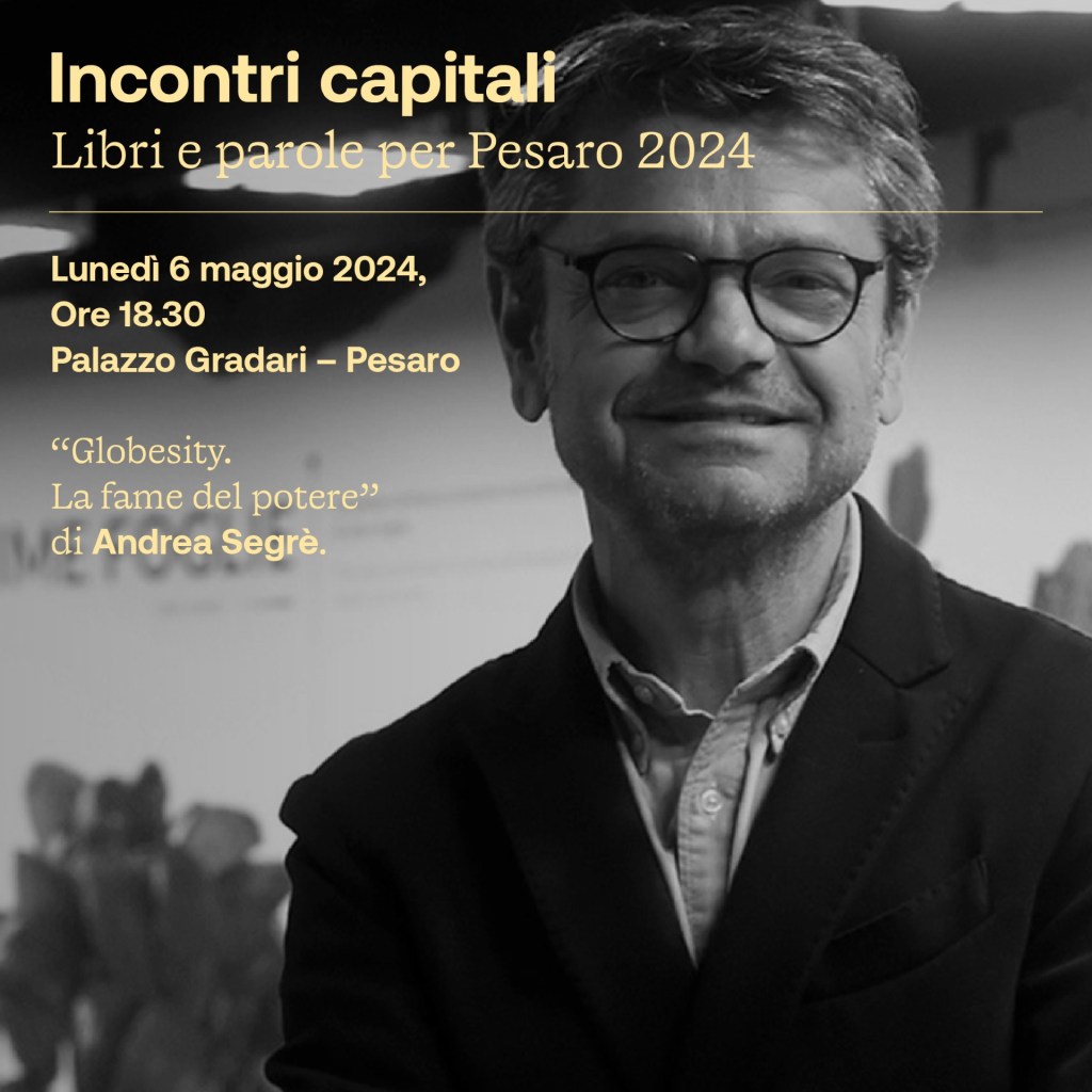 Un thriller alimentare sospeso tra realtà e immaginazione: si intitola ‘Globesity. La fame del potere’ (Edizioni Minerva) il romanzo d’esordio di Andrea Segrè, che l’autore presenterà a Pesaro ospite di ‘Incontri capitali’ lunedì 6 maggio in una conversazione con il giornalista e scrittore Alfredo Antonaros (Palazzo Gradari, ore 18.30).