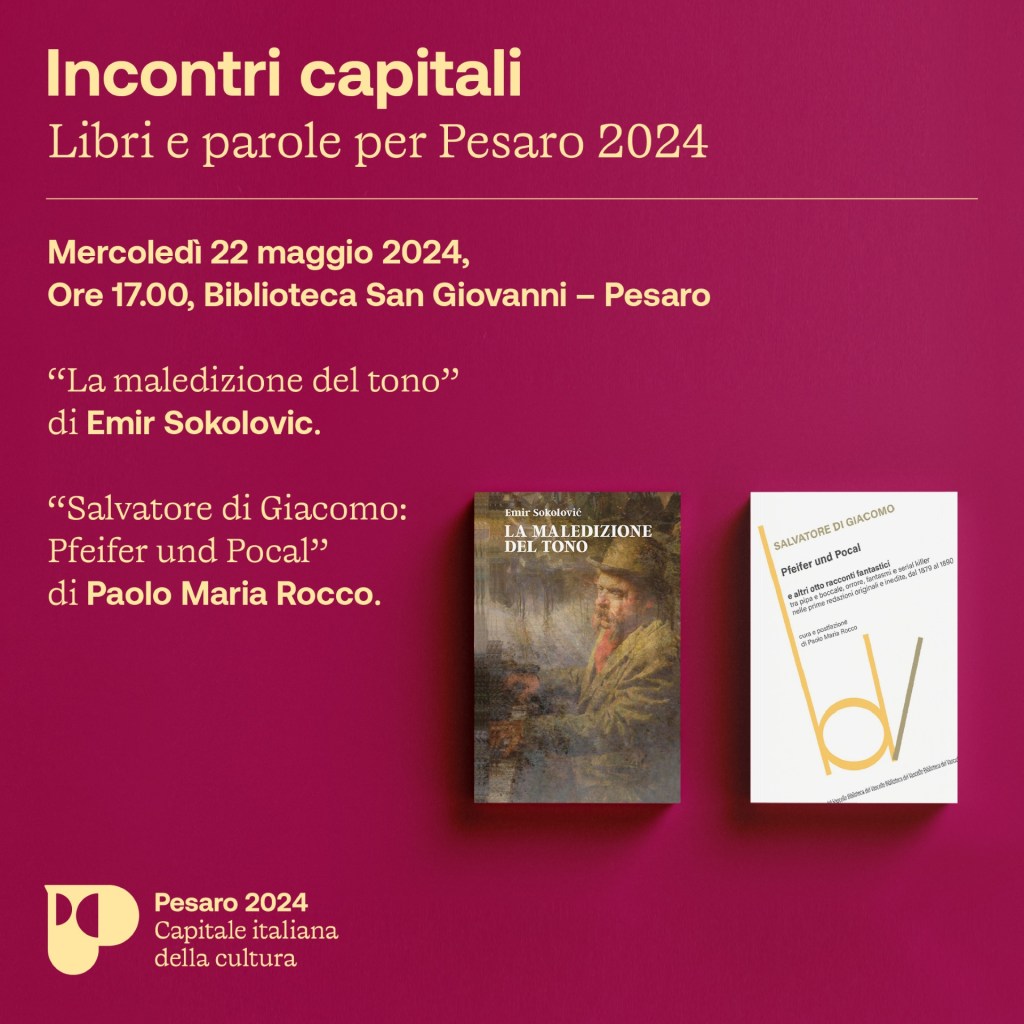 Due i libri che ci proporrà il prossimo degli ‘Incontri capitali’ in programma mercoledì 22 maggio a Pesaro all’interno della Biblioteca San Giovanni (ore 17.00). Protagonisti dell’evento Emir Sokolović autore di ‘La maledizione del tono’ (Planjax Group) e Paolo Maria Rocco curatore del libro ‘Pfeifer und Pocal e altri otto racconti fantastici’ di Salvatore di Giacomo. (Biblioteca del Vascello).