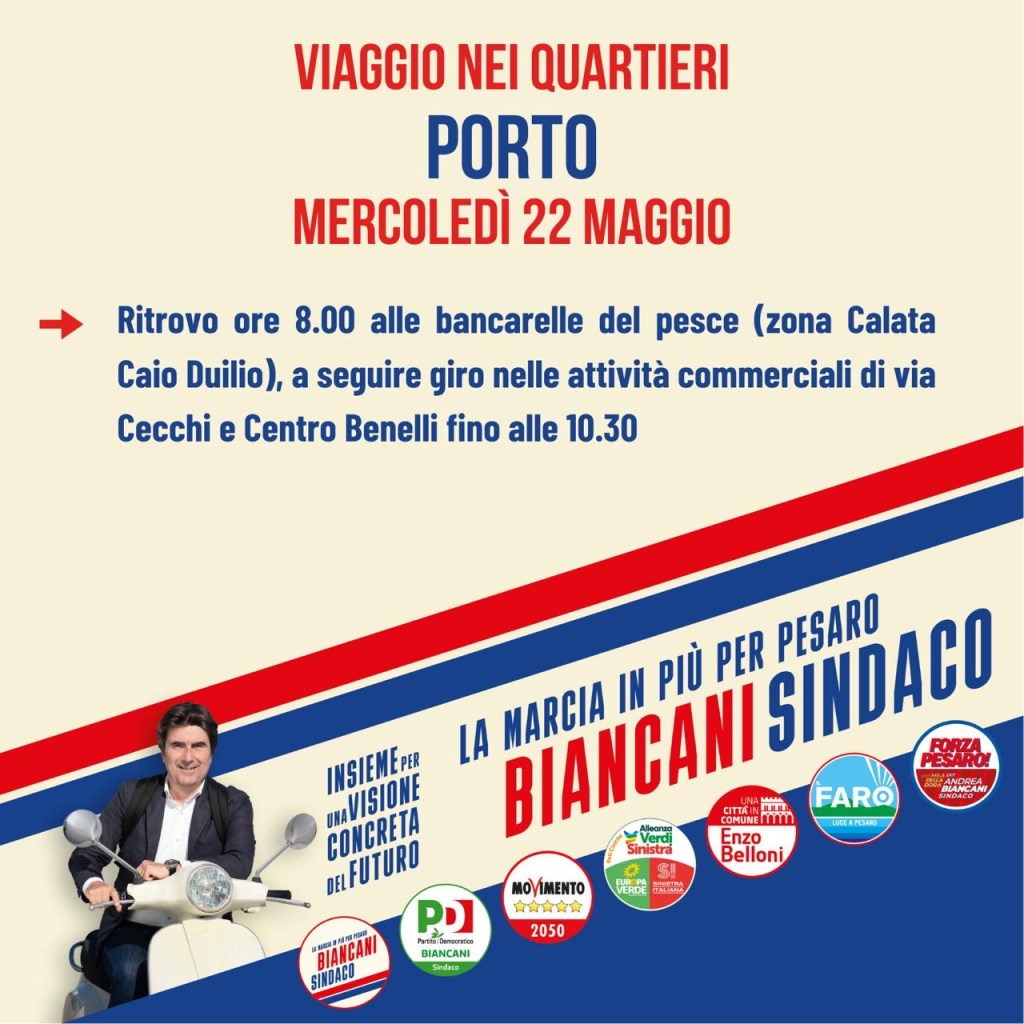 Dopo Loreto, Montegranaro, Muraglia, il Centro, le Colline, Borgo Santa Maria e Case Bruciate, Baia Flaminia e Soria, Pantano e Villa Fastiggi, Vismara, Cattabrighe, San Bartolo e l’Arzilla domani mattina sarà la volta del Porto, Tombaccia e Santa Maria delle Fabbrecce. Ritrovo ore 8.00 alle bancarelle del pesce (zona Calata Caio Duilio), a seguire giro nelle attività commerciali di via Cecchi e Centro Benelli fino alle 10.30.
