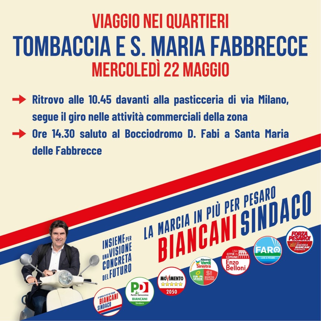 Domani, mercoledì 22 maggio, prosegue il Viaggio nei Quartieri del candidato sindaco Andrea Biancani.