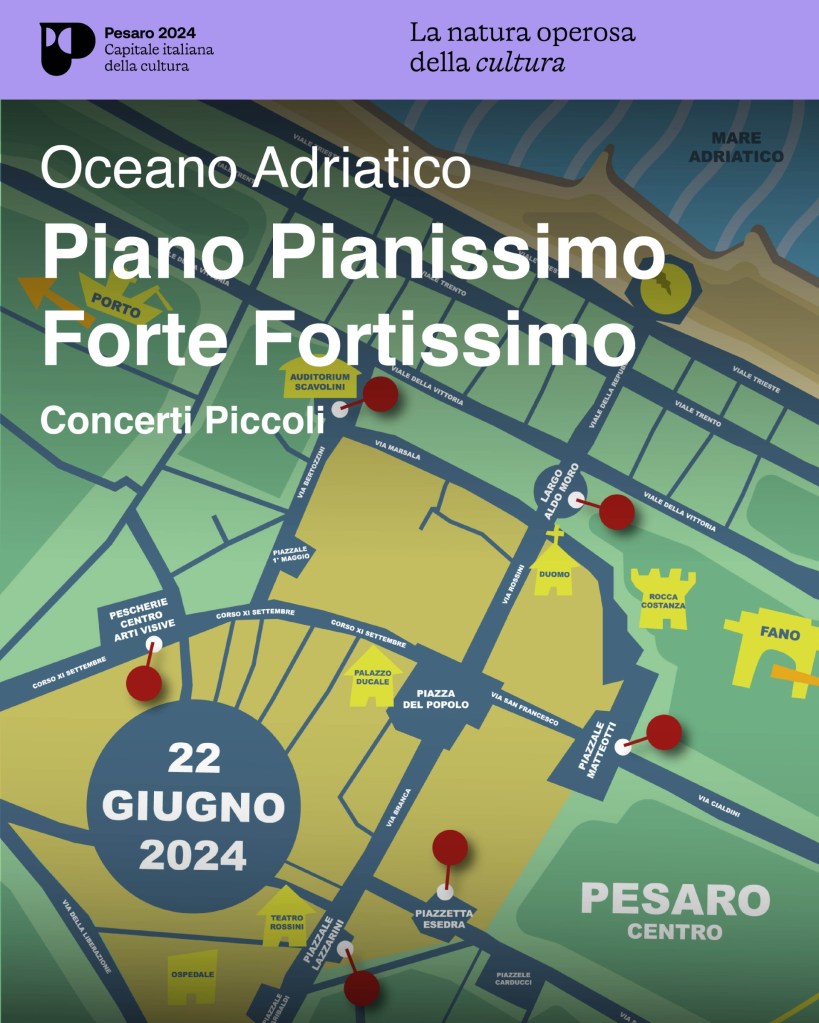 (Pesaro) – Occupare una pizza, una piazzetta o uno slargo nel centro storico di Pesaro per suonare musica dal vivo a basso volume, senza una vera e propria amplificazione, per contribuire a creare letteralmente il suono della città, sempre in movimento, fra suoni naturali, rumori, musica. È questo l’obiettivo di Concerti Piccoli, due giornate, a giugno e a ottobre, di concerti a basso volume. Venerdì 14 giugno 2024 il termine ultimo per iscriversi e suonare alla prima giornata di Concerti Piccoli. L’iniziativa rientra nell’ambito della sezione Piano Pianissimo/Forte Fortissimo di Oceano Adriatico, progetto di Labirinto cooperativa sociale, inserito nel dossier Pesaro 2024 – Capitale italiana della cultura.