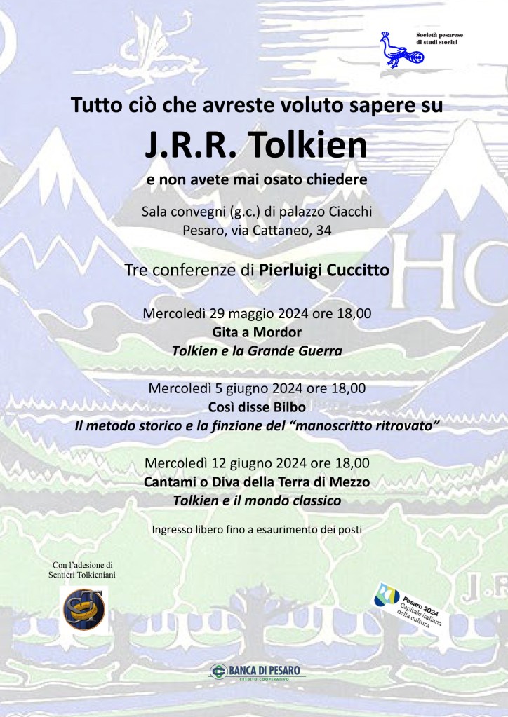 Seconda conferenza di Pierluigi Cuccitto Pesaro, via Cattaneo 34 (palazzo Ciacchi) mercoledì 5 giugno 2024 ore 18,00 Così disse Bilbo Il metodo storico e la finzione del manoscritto ritrovato Il metodo compositivo di Tolkien muove verso la creazione di un mondo fantastico ma con uno sfondo storico ben delineato, tramite la finzione narrativa del ritrovamento di manoscritti antichi, che l’autore traduce e riporta al pubblico moderno. Questa conversazione, come la precedente, rimane registrata nel canale Youtube della Società pesarese di studi storici https://www.youtube.com/@societapesaresedistudistorici. Pierluigi Cuccitto (Urbino 1981), scrittore e saggista, studioso e divulgatore delle opere di Tolkien tramite il blog Migrantes of Middle Earth, membro attivo dell’associazione culturale Sentieri Tolkieniani, è laureato in Beni culturali e Ricerca storica. Ha pubblicato la favola fantasy Lo specchio è oltre (2013), i romanzi Il ragazzo in ritardo (2017), Nandèra. Il ragazzo della profezia (2022), I tre regni dell’odio (2023) e, di recente, Diario disprassico. Per la Società pesarese di studi storici nel 2023 ha curato una ricerca sull’esodo giuliano-dalmata in queste terre, che poi è diventata Dall’Istria a Pesaro, nella collana Asterischi. |