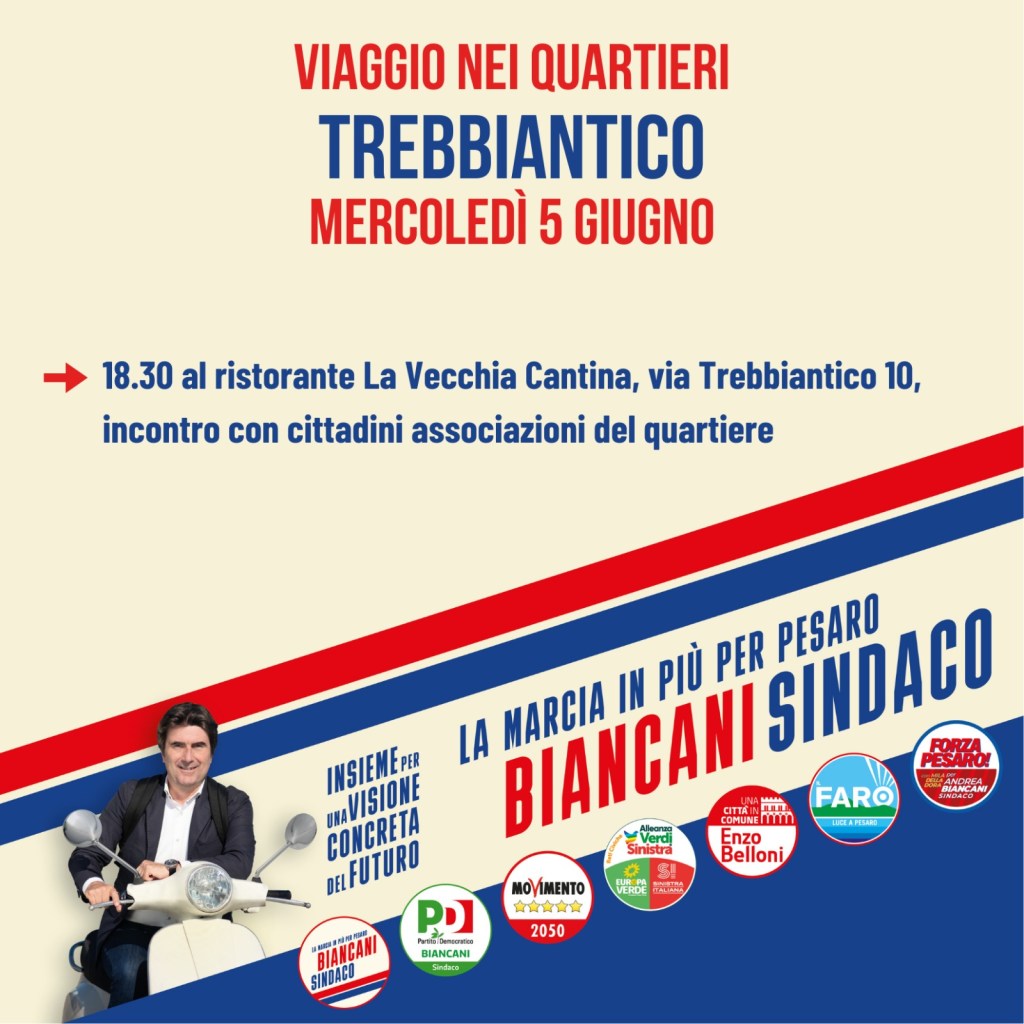 Dopo Loreto, Montegranaro, Muraglia, il Centro, le Colline, Borgo Santa Maria e Case Bruciate, Baia Flaminia e Soria, Pantano e Villa Fastiggi, Vismara, Cattabrighe, San Bartolo, Arzilla, Porto, Tombaccia, Santa Maria delle Fabbrecce, Celletta, Cinque Torri, Santa Veneranda, Villa San Martino, Villa Ceccolini, Ginestreto, Monteciccardo, sarà la volta di Trebbiantico. Ritrovo alle 18.30 al ristorante la Vecchia Cantina, via Trebbiantico 10, per l’incontro con i cittadini e le associazioni del quartiere.