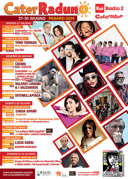 Dal 27 al 30 giugno, il popolo di Caterpillar si prepara a convergere su Pesaro 2024 – Capitale italiana della cultura. Il CaterRaduno è un festival diffuso: da Baia Flaminia a Piazza del Popolo fino al Teatro Sperimentale, per festeggiare insieme con una quattro giorni non-stop di eventi totalmente gratuiti dal tramonto all’alba e fino alla notte, per ballare, riflettere, condividere e ascoltare grande musica dal vivo in diretta su Rai Radio2, sul Canale 202 del digitale terrestre, su RaiPlay e RaiPlay Sound.