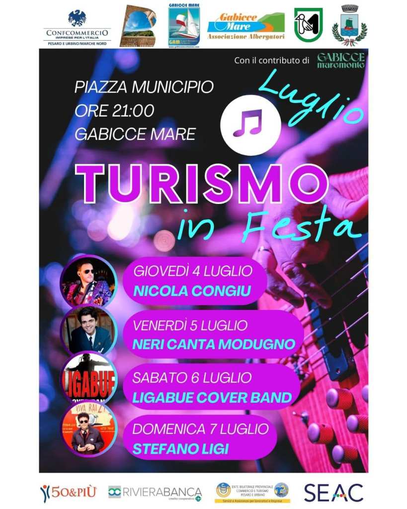 Scatta giovedì 4 luglio la nona edizione di ‘Turismo in Festa’, la manifestazione che animerà l’estate di Gabicce Mare con quattro appuntamenti a luglio (4-5-6-7) ed altrettanti nel mese di agosto (3-4-5-6). La manifestazione è promossa come sempre da Confcommercio Marche Nord, dall’Associazione Albergatori Gabicce Mare e dal Gruppo Albergatori Multiservizi, con il contributo del Comune e il sostegno di 50&Più, RivieraBanca, Ente Bilaterale Commercio e Turismo Pesaro Urbino, Seac e Regione Marche.