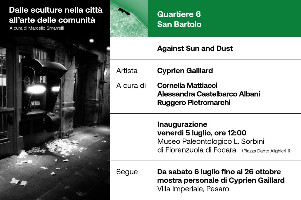 Protagonista è il Quartiere 6 – San Bartolo che svela alla città ‘Against Sun and Dust’, il progetto a cura di Cornelia Mattiacci e Alessandra Castelbarco Albani, con Ruggero Pietromarchi concepito per due sedi: il Museo Paleontologico L. Sorbini di Fiorenzuola di Focara e Villa Imperiale dove una mostra di Cyprien Gaillard sarà visitabile da sabato 6 luglio al 26 ottobre.